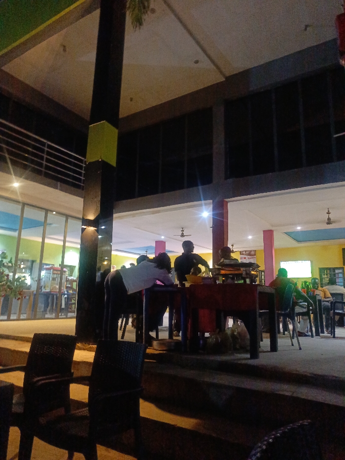 This image captures an evening scene at a multi-level establishment in Akwanga, Nigeria, featuring an outdoor or semi-outdoor dining area