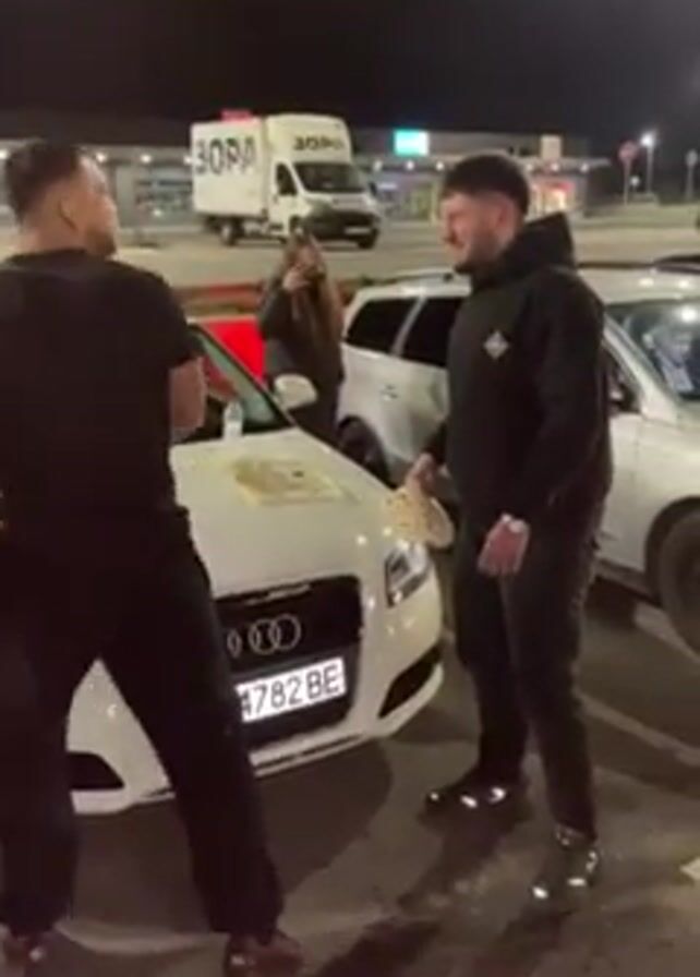 Two men stand in a parking lot at night beside a white Audi with Bulgarian license plate PB 4762 BE