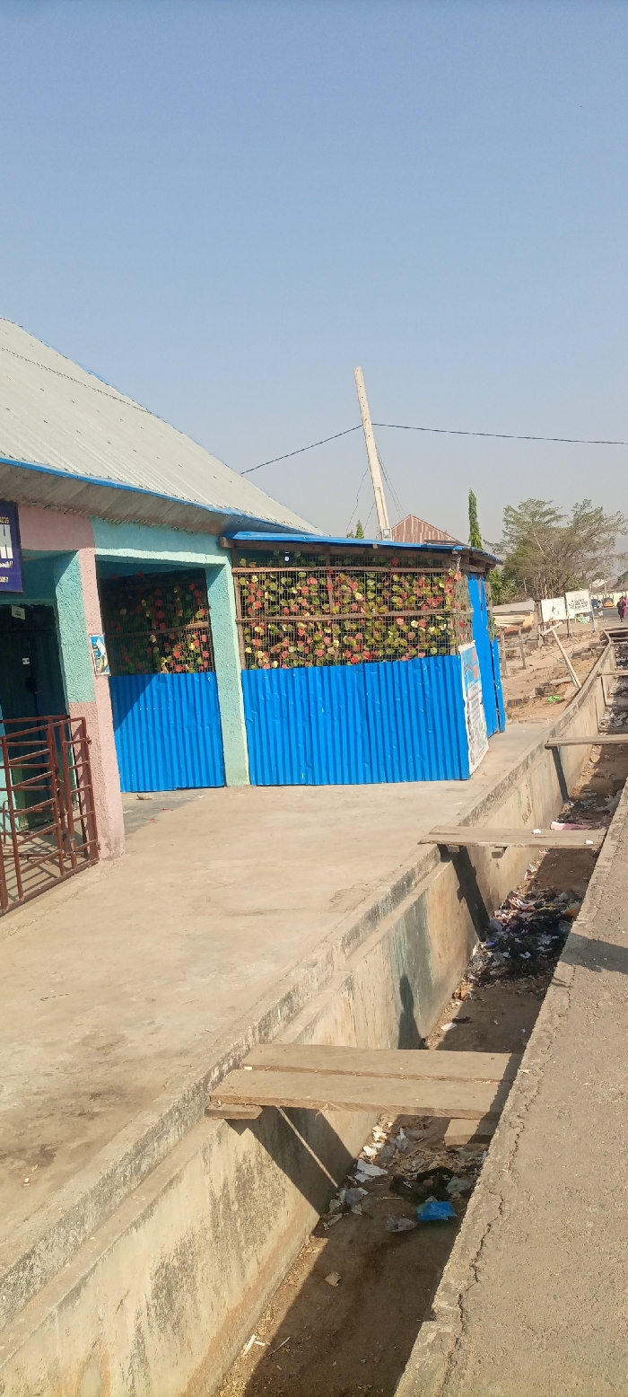 This image depicts an outdoor scene in Howayi, Nigeria, under a clear blue sky. In the immediate foreground, an open concrete drainage channel runs parallel to a concrete pathway. The channel contains accumulated refuse, including plastic bags and various debris. Three untreated wooden planks are positioned across the channel, serving as rudimentary crossings. To the left, a single-story building is visible, featuring a light gray corrugated metal roof. Its facade is painted in light blue and pink tones. A section of the building's exterior is enclosed by bright blue corrugated metal panels, topped by a trellis adorned with artificial flowers in red, green, and yellow hues. A dark metal gate is situated near an entrance on the left side of the building. A poster is affixed to the wall next to the gate. In the mid-ground, an unpaved area or dirt path extends beyond the drainage channel. A light-colored utility pole, slightly angled, rises from this area, with overhead wires visible. Further in the background on the right, a lone individual in dark clothing is partially visible walking on the dirt path. Distant, indistinct structures, including one with a reddish-brown roof, along with sparse trees and vegetation, are present. The scene is illuminated by direct sunlight, casting distinct shadows.