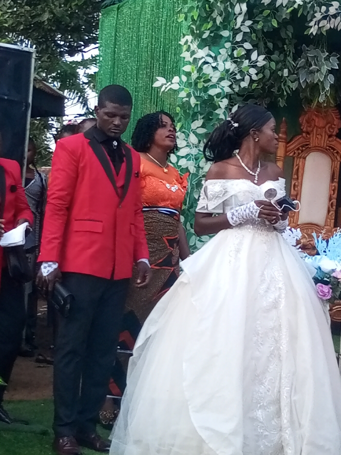 This image captures an outdoor event in Amokvo, Nigeria, featuring three primary individuals positioned against a decorated green backdrop. On the left, a dark-skinned male, with short dark hair, stands wearing a red blazer with black lapels, a black waistcoat, a black shirt with a silver bolo tie, and black trousers. His right hand holds a black clutch bag, and a white patterned cuff is visible on his wrist. His gaze is directed downwards. Adjacent to him, a dark-skinned female with curly dark hair wears an orange lace top with ruffled shoulders and a multi-patterned skirt. She has a gold necklace and appears to be speaking or singing, with her mouth slightly open and her head tilted upwards and to the right. To the right, a dark-skinned female, with dark hair styled in a ponytail, is dressed in a white off-the-shoulder ball gown with intricate lace detailing. She wears a pearl necklace and white lace fingerless gloves. In her left hand, she holds a white, circular object and a black face mask. Her head is turned to the right, away from the direct view of the camera. The background comprises a green, vertically-striped fabric backdrop ornamented with artificial green foliage. To the far right, a portion of an ornate, carved wooden chair is visible, and a floral arrangement with blue and purple elements is situated nearby. A black speaker unit is partially visible on the far left. Natural tree foliage is present above the constructed backdrop, and the ground in the foreground is covered in green, resembling grass.