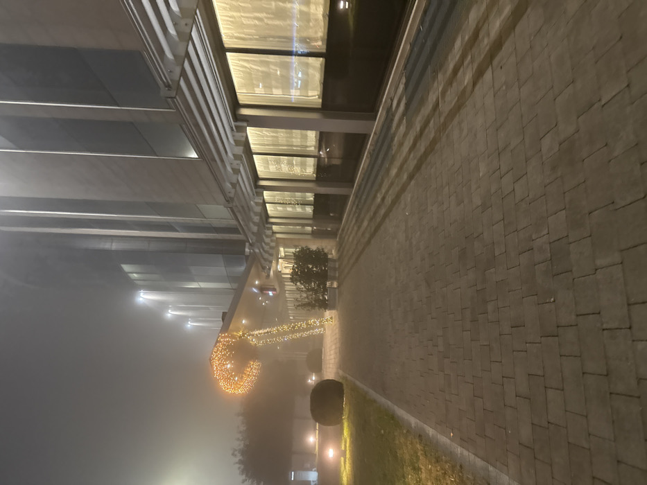 A building facade under foggy conditions features illuminated windows and a modern, multi-layered exterior. A brick walkway stretches along the right side, bordered by grass. Decorated trees with warm lights are prominent along the walkway, creating a festive atmosphere despite the heavy fog. The scene conveys a sense of urban quietude, with the fog obscuring distant details and focusing attention on the immediate architectural and decorative elements.