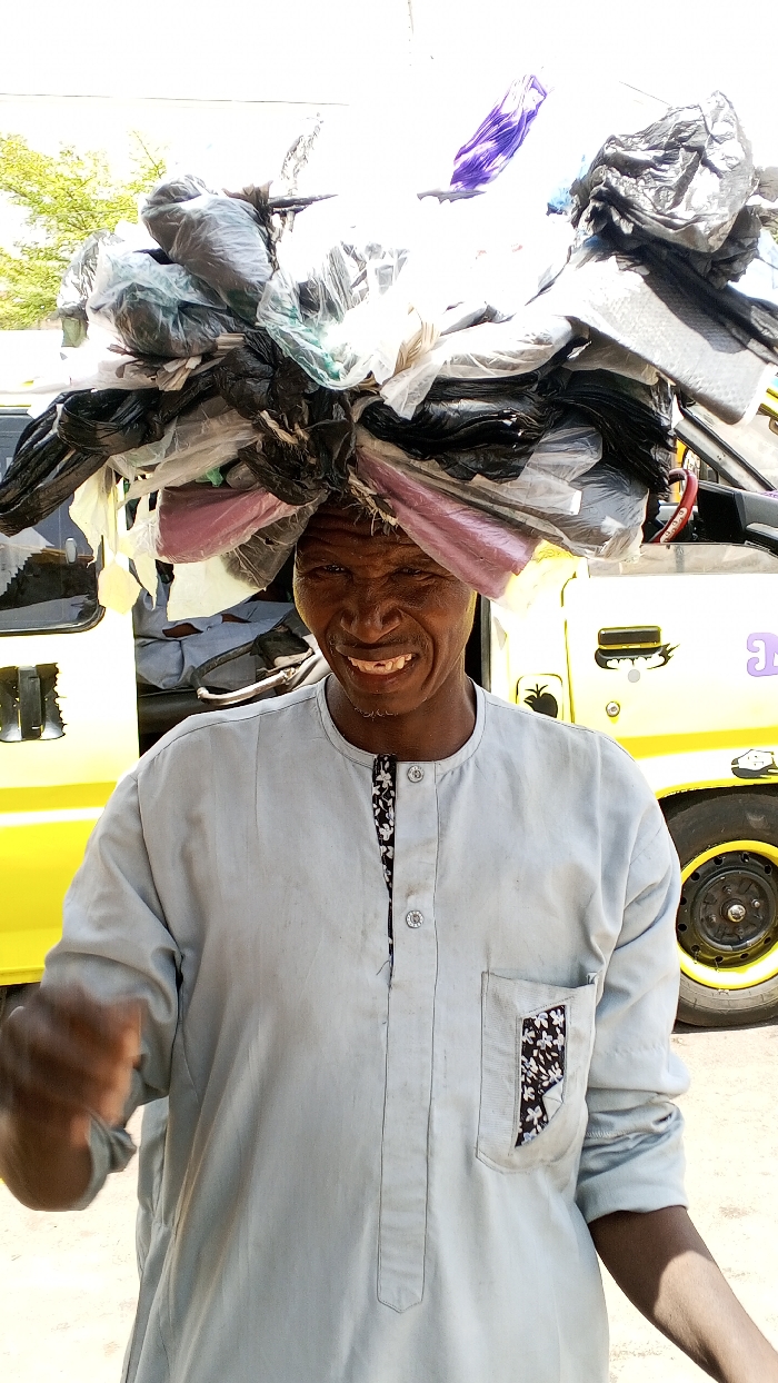 An adult male is depicted outdoors in Maiburiji, Nigeria, under bright sunlight. He possesses dark skin, short hair, and is shown smiling broadly, revealing several visible teeth, some appearing chipped or missing. A substantial, irregular stack of various plastic bags, primarily black, white, clear, and hints of purple and pink, is balanced on his head. He wears a light grey, long-sleeved tunic featuring a round neckline, a partial button placket with a dark floral pattern, and a chest pocket with matching floral trim. His right hand is partially visible and blurred, suggesting motion. In the background, the side of a yellow commercial vehicle, possibly a minibus, is present, displaying a side door handle, a black tire on a yellow rim, and dark graphic decals, including a stylized apple and purple text. Green foliage is visible in the upper left portion of the frame, and the ground surface is light-colored.