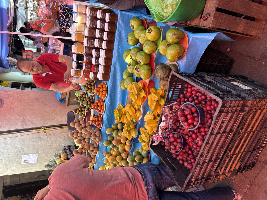A vibrant marketplace scene showcases an array of fruits and honey. A vendor in a red shirt attends to customers at a stall covered with a blue cloth. Jars of honey line the back, followed by green fruits, small orange fruits on plates, and starfruit. Sapodilla and plums in baskets occupy the lower portion. The scene is bustling with activity, and the perspective is slightly rotated.