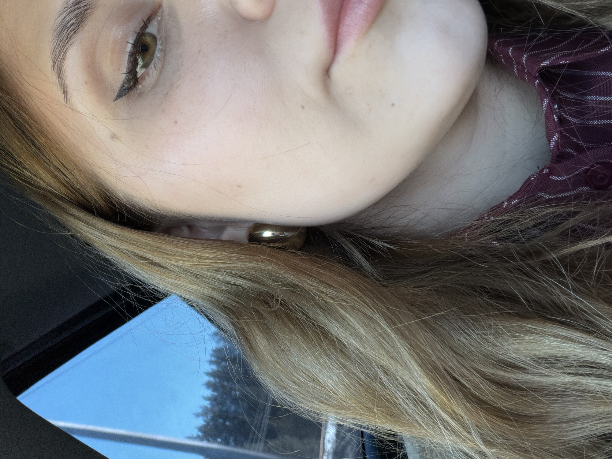 A close-up, angled photograph captures a person with fair skin, light brown and blonde hair, and brown eyes with eyeliner. A gold hoop earring is visible on the left side of the frame. The person is wearing a burgundy colored, collared shirt. In the lower-left corner, a car window reflects the sky and trees. The location is not specified.