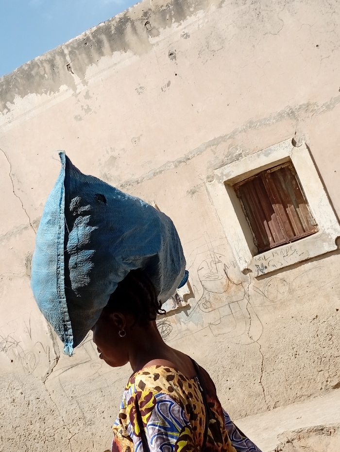 The image depicts an individual in profile in Gwagwarwa, Nigeria, seen from the mid-torso upwards, facing left, under clear daylight. The person, with dark skin and braided hair, is balancing a large, irregularly shaped blue sack, likely made of woven synthetic material, on their head. A small, silver-colored hoop earring is visible on the left ear. The individual wears a multi-colored garment featuring patterns in shades of brown, yellow, blue, and purple. The background consists of a weathered, light-colored, possibly beige or off-white, stucco or painted wall. This wall exhibits numerous fine cracks, discoloration, and areas where plaster appears eroded. Crude, dark-colored graffiti, including abstract lines and rudimentary facial outlines, is present on the lower section of the wall. Towards the upper right, a rectangular window opening is fitted with closed, dark-brown, possibly wooden or metal, louvered shutters. The window frame has minimal decorative elements at its upper corners. Above the wall, a clear blue sky is visible.