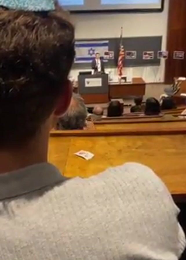A person in a grey shirt films a lecture being given in a tiered lecture hall. The lecturer, a man in a suit, stands behind a podium bearing the Princeton University logo. Behind him are the flags of Israel and the United States, along with several framed photographs. A presentation screen displays text on either side of the speaker. The audience is diverse in age and gender, with heads visible in the rows below the videographer. A small, possibly printed, object lies on the desk in front of the videographer.