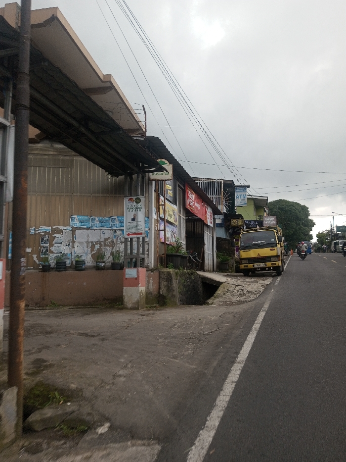 A street scene shows a yellow truck parked beside a road. A storefront lined with signs and advertising sits on the left, displaying posters and a pile of what appear to be water bottles. An awning overhangs the building. Power lines stretch across the overcast sky. Other vehicles and pedestrians are visible further down the road. The road itself has a white line marking its edge.