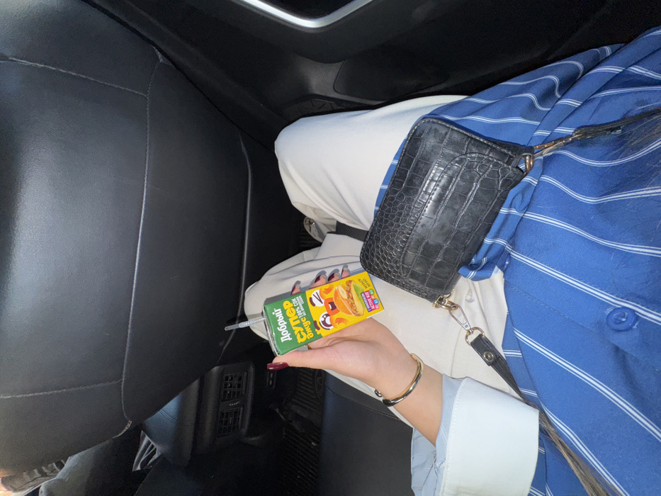 The image depicts the interior of a vehicle in Yerevan, Armenia, observed from an elevated, slightly forward-looking perspective, likely from a back seat. A person's lower torso, lap, and right arm are visible. The individual is wearing a blue and white striped long-sleeved garment with a white cuff on the right arm, and light-colored (possibly white or beige) pants. The right hand, with dark red nail polish and a gold-colored bangle bracelet on the wrist, holds a small yellow "Добрый Супер Джус 100% сок" (Dobryy Super Juice 100% juice) carton. A white straw is inserted into the carton, which features a cartoon character and a burger graphic. Resting on the person's lap, to the right of the juice carton, is a black, crocodile-embossed small purse or wallet with gold-toned hardware, attached to a black strap. The background shows the black leather backrest of a front vehicle seat, with a rectangular air vent visible on the lower left portion. The vehicle's interior is predominantly dark, with a window partially visible on the far right. No specific landmarks or street details are discernible to pinpoint an exact location within Yerevan.