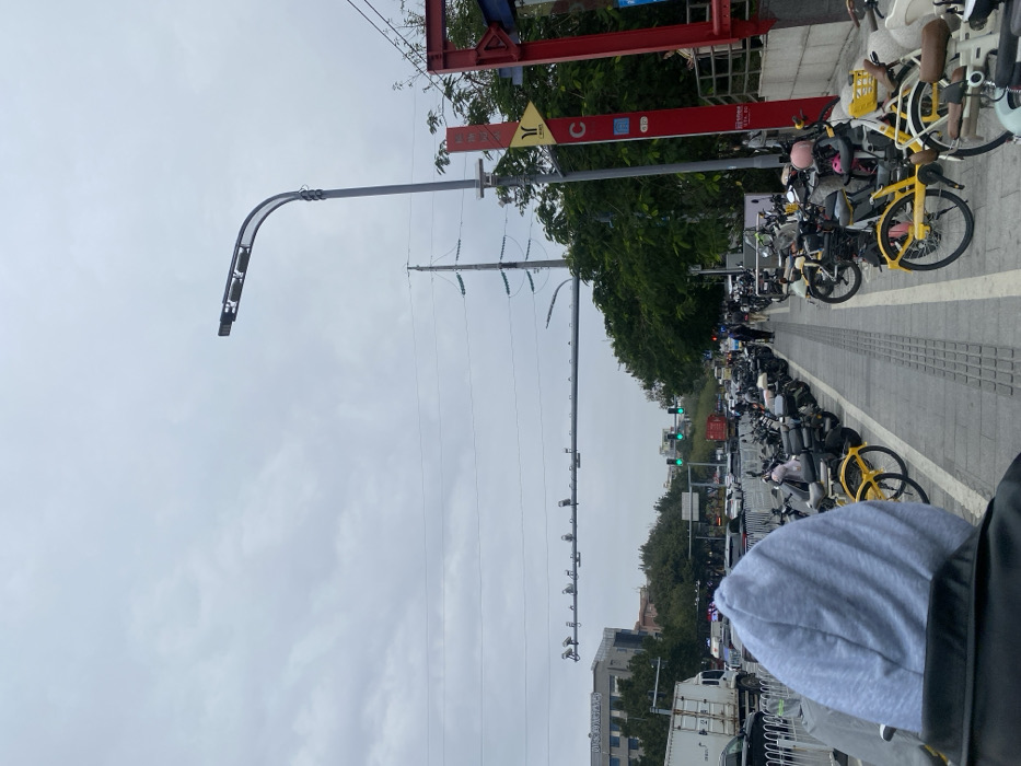 A sideways view showcases a street with parked bikes and motorcycles along a sidewalk. Overhead, a light post and power lines stretch across the sky. Beyond the bikes, traffic moves past trees and buildings. The sky is overcast. A person's hood and backpack are visible in the foreground.