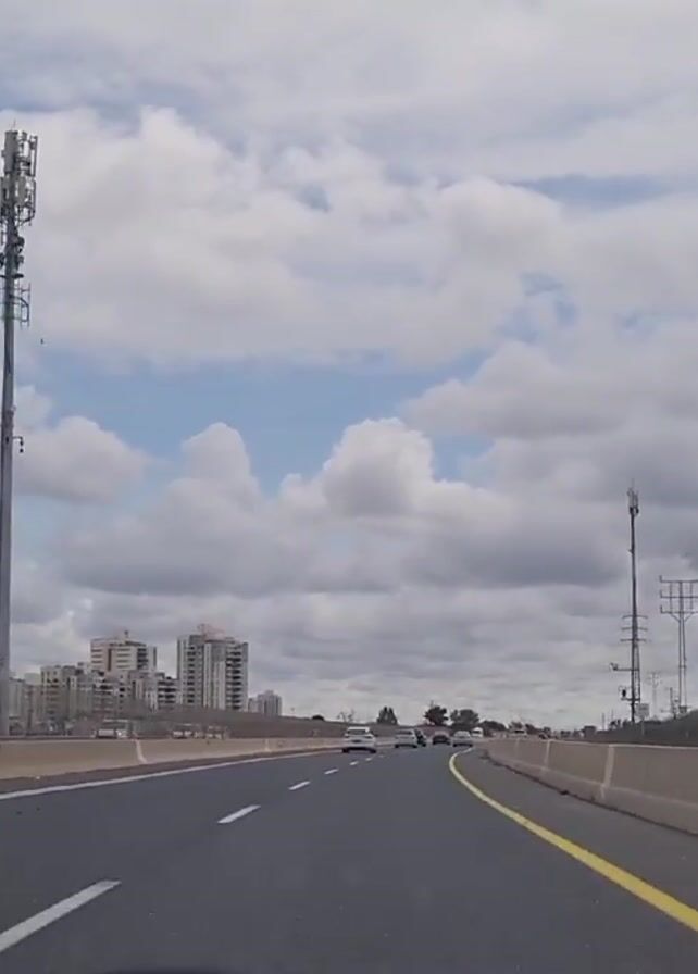 highway with multiple lanes in both directions. A yellow line separates the rightmost lane from the shoulder. Concrete barriers line both sides of the road. On the left side, there are several modern-looking high-rise buildings in the distance. On the right side, there is a grassy area with yellow wildflowers. In the sky, there are numerous puffy white clouds against a blue backdrop. Several cell phone towers are visible along the side of the road. Cars are driving in both directions. A sign is visible to the right.