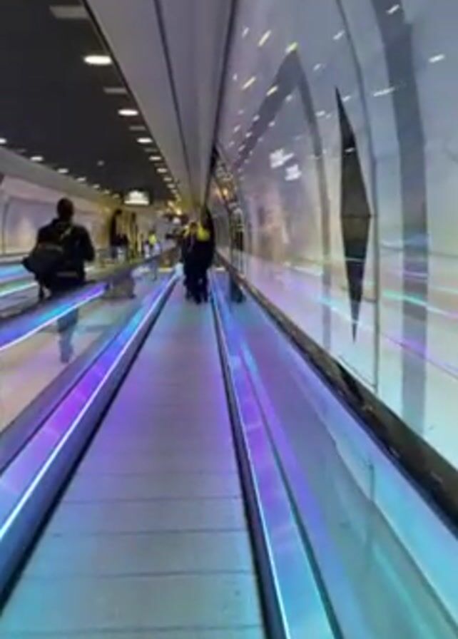 moving walkway with people on it. The walls are decorated with geometric patterns and illuminated with blue and purple lights. The ceiling is dark with recessed lighting. The moving walkway is heading toward an area with more people and signs.