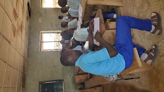 The image captures an interior view of a classroom in Akwanga, Nigeria, during daylight