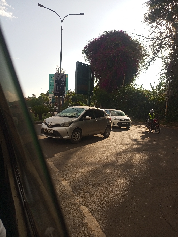 The image presents a daytime street scene in Nkaimurunya ward, Kenya, featuring vehicular traffic and urban vegetation under a bright sky with strong sunlight casting long shadows. In the foreground, a silver five-door hatchback, specifically a Toyota Vitz/Yaris with Kenyan license plate KDG 627C, is stationary on the asphalt road, angled slightly towards the left. Behind it, a white four-door vehicle, likely another Toyota model, is partially visible. To the far right, a male individual wearing a white helmet and a bright yellow-green high-visibility vest sits astride a red motorcycle with black accents. The road surface is dark asphalt with faded white lane markings. The perspective is from inside a vehicle, with a dark window frame visible on the left. On the left side of the road, a tall, dark street light pole with a bifurcated top supports two overhead lamps. Several advertising billboards are visible behind the street light; one displays a "Risaa" logo, and another features two dark human figures against a light background with text reading "Choose Your Me." Dense vegetation dominates the right side of the background, including a large, rounded mass of intertwined branches heavily covered in purple flowering vines, possibly Bougainvillea. Smaller green shrubs and palm-like plants are also present along the roadside. The sky is clear with minimal cloud cover.