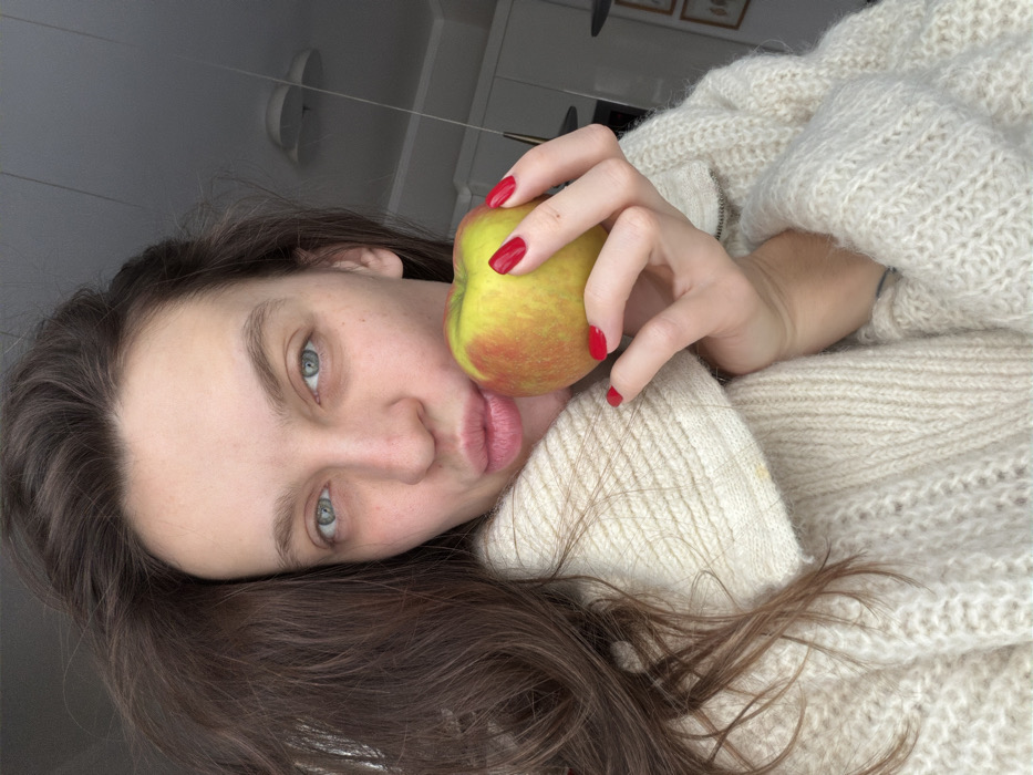 A medium close-up, indoor selfie depicts an adult female subject with long, dark brown hair, parted to her right, cascading over her left shoulder. She has light blue-green eyes and her face shows minimal makeup, with visible natural skin texture. Her lips are pursed in a slight pout. She is wearing a cream-colored, heavily textured, knitted sweater with a high, ribbed collar and a visible yellow-brown stain on the collar's interior fold, near her chin. Her left hand, adorned with bright red nail polish on all visible fingernails, holds a bi-colored apple (primarily yellow-green with significant red blushing) against the lower left side of her face. The background is an indistinct, light-colored interior space, possibly a kitchen or living area, with a white ceiling featuring recessed lighting or a flush-mount fixture, and what appear to be framed pictures or objects on a wall in the upper right background. The scene is located in a private residence in the city of Korolyov, Russia.
