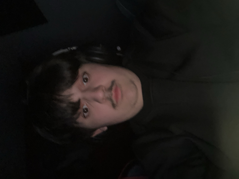 A dimly lit, slightly blurry image shows a young person with dark hair and a drawn-on mustache. The person is wearing headphones and looking directly at the camera with a slightly quizzical expression. The background is mostly dark and obscured, with only vague shapes visible. The overall image is close-up and slightly tilted, giving a somewhat distorted perspective of the subject.