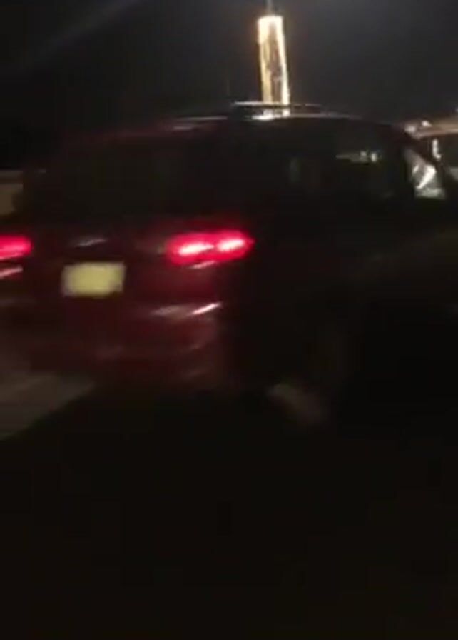 The video depicts a night-time street scene. Several cars and a motorcycle pass by, traveling away from the camera's perspective. Streetlights illuminate the road and decorative columns lining the roadside. A large sign is visible in the distance over the road. The road appears to be a multi-lane highway or major thoroughfare. The video is handheld and slightly shaky.
