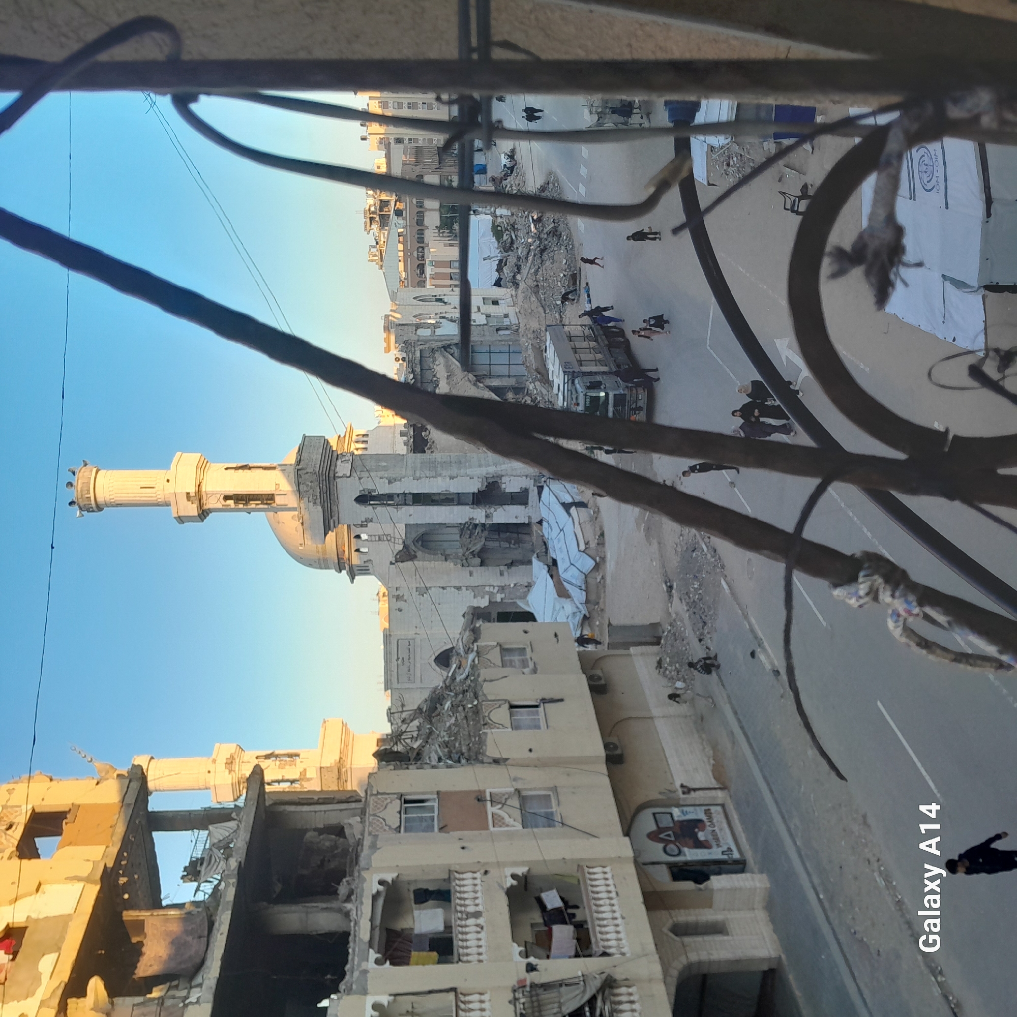 The image, taken in Khan Yunis, Palestinian Territory, shows a scene of urban destruction. A mosque with a partially destroyed minaret and dome stands amidst heavily damaged buildings. Debris is visible on the street and surrounding areas. People are seen walking on the street, seemingly navigating through the devastation. A truck is parked nearby. The photo is taken from an elevated position, possibly from a building, with some iron railings or a balcony structure visible in the foreground. The sky is clear and blue.