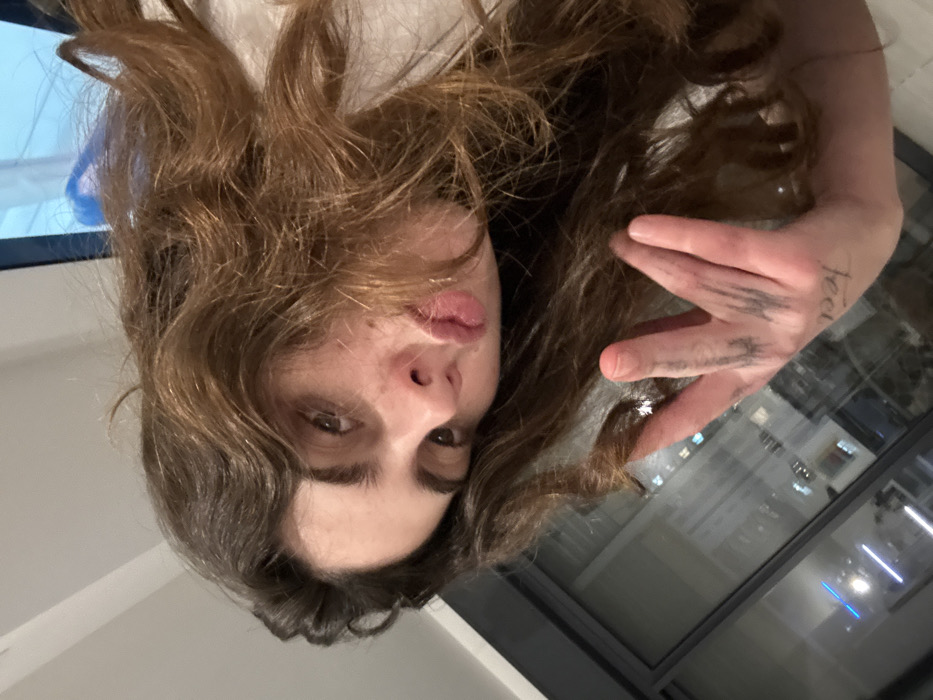 A person with brown, wavy hair is positioned upside down in the frame, gazing directly at the viewer with a slight smirk. Their hand, smudged with dark marks, is raised, obscuring a part of the background visible through a window. City lights are visible through the window. A tattoo appears on the hand. The background suggests an indoor setting with neutral-toned walls.