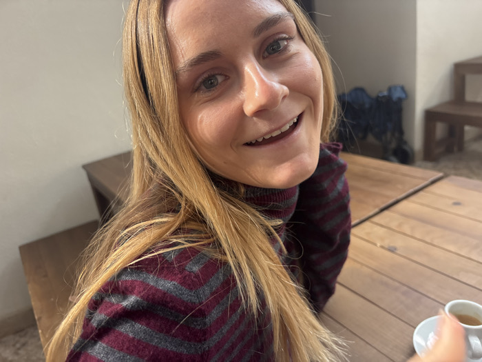 A close-up, frontal image captures a female individual indoors in Porto Salvo, Portugal. The subject, a woman with long blonde hair and a fair complexion, occupies the majority of the frame, facing the camera with a wide smile, displaying her teeth. She is wearing a high-neck sweater patterned with alternating burgundy and gray chevron stripes. Her right hand is partially visible in the bottom right corner of the frame. The immediate foreground features a light-colored wooden table with a distinct plank pattern. On the table, to the right, a white espresso cup on a matching saucer contains a small amount of dark liquid. Adjacent to the cup is a small white packet. The background consists of a light-colored wall to the left and a darker area to the right, where dark wooden furniture, possibly benches or table bases, is discernible. An indistinct dark object is present in the distant background.