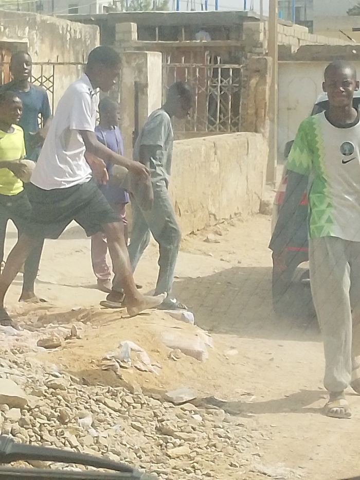 This image depicts an outdoor scene in Hotoro South, Nigeria, on an unpaved, dusty road under bright daylight conditions
