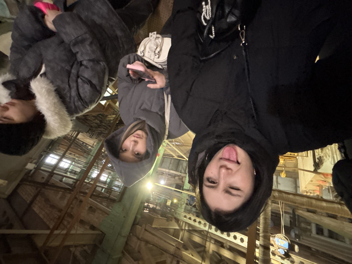Three young women in hooded winter coats pose for a selfie in what appears to be an old factory or warehouse. The woman closest to the camera sticks her tongue out and winks. The factory is filled with scaffolding, pipes, and large beams. The lighting is dim.
