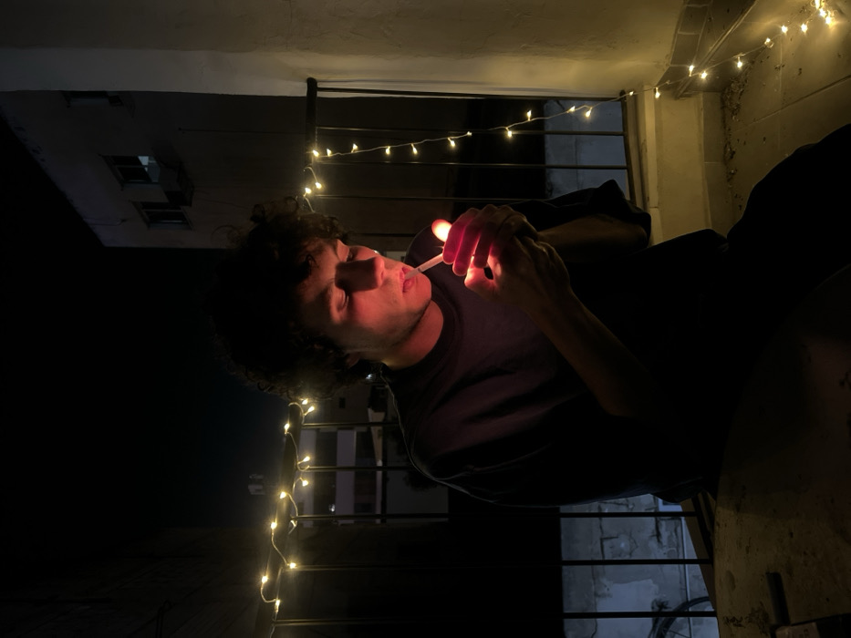 A person with curly hair is lighting a cigarette outside at night, illuminated by the flame. The scene is decorated with small string lights. The background shows urban elements, including a building and what appears to be a balcony or staircase. The person is dressed in dark clothing. The overall mood is atmospheric and contemplative.