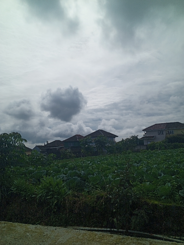 A field of leafy green plants, possibly cabbages, extends toward several houses with red-tiled roofs under a cloudy, overcast sky. The cloud cover is dense and gray, suggesting possible rain. Vegetation grows densely in the foreground. The scene is quiet and possibly rural, depicting a landscape with a blend of agriculture and residential living.