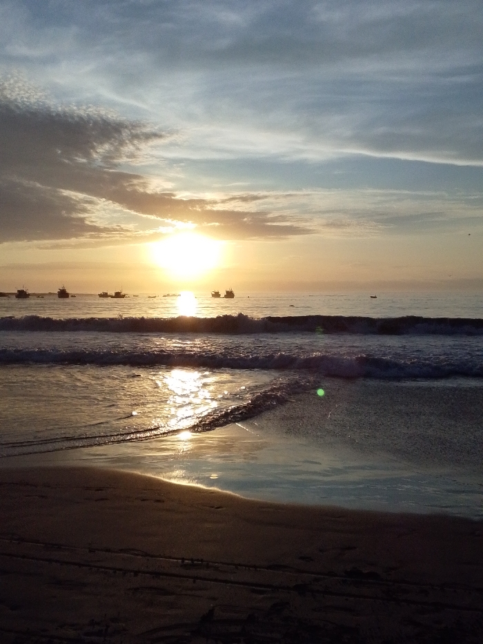 A beach scene at sunset with waves gently rolling onto the shore. The sun, a bright orb, is low in the sky, reflecting off the water and the wet sand. Several boats are silhouetted against the horizon. The sky is a mix of blue, gray, and orange hues, with scattered clouds. The foreground consists of dark sand, transitioning to the reflective water surface. A lens flare is visible near the water's edge.