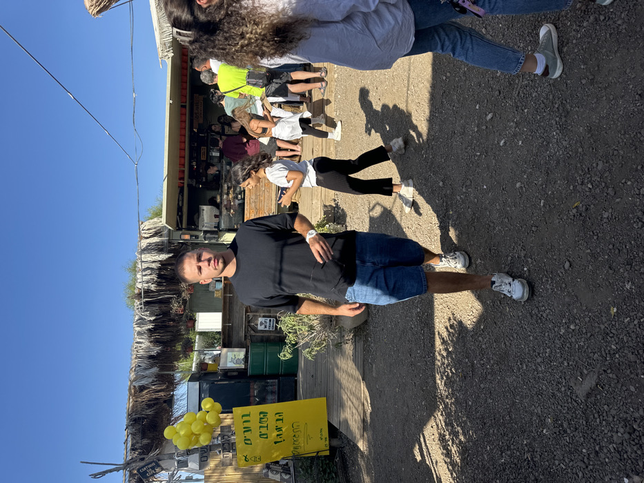The image depicts an outdoor daytime scene in Kfar Ruth, Israel, characterized by a gravelly dirt pathway and bright sunlight casting distinct shadows. In the foreground and center-left, a male individual with short brown hair, wearing a black short-sleeved t-shirt, blue denim shorts, and white sneakers, walks towards the viewer. He holds dark-rimmed glasses in his right hand and wears a white watch on his left wrist. His expression is neutral as he looks directly ahead. To the right of the main subject, in the mid-ground, a young female with dark hair, wearing a white t-shirt, black cropped pants, and white sneakers, walks away from the camera, looking down at a small object in her hands. Further right, a partial view of another female with long, curly dark hair, wearing a light-colored long-sleeved top and blue jeans, is visible. In the background, a food truck or concession stand with an open service window is visible, featuring an awning constructed from thatched material. A queue of several individuals stands before the food truck, suggesting activity related to purchasing items. At least two individuals are visible behind the counter of the food truck. To the left of the main subject, a rudimentary outdoor structure with a thatched roof is present. A yellow sign with Hebrew text and graphics, including a house icon, is affixed to a pole beside a cluster of yellow balloons. A green metal barrel and a "WIFI" sign are also visible near this structure. The sky is clear blue overhead.