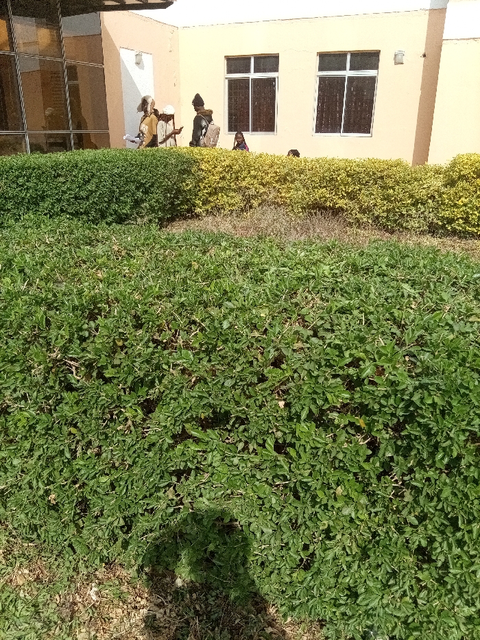 A hedge dominates the foreground with vibrant green foliage. Behind this is another, slightly yellowed, hedge. Beyond the hedges is a light tan building with large windows. Several people are visible near the building, some standing behind the first hedge, while others are closer to the building itself. The scene appears to be outdoors in daylight.