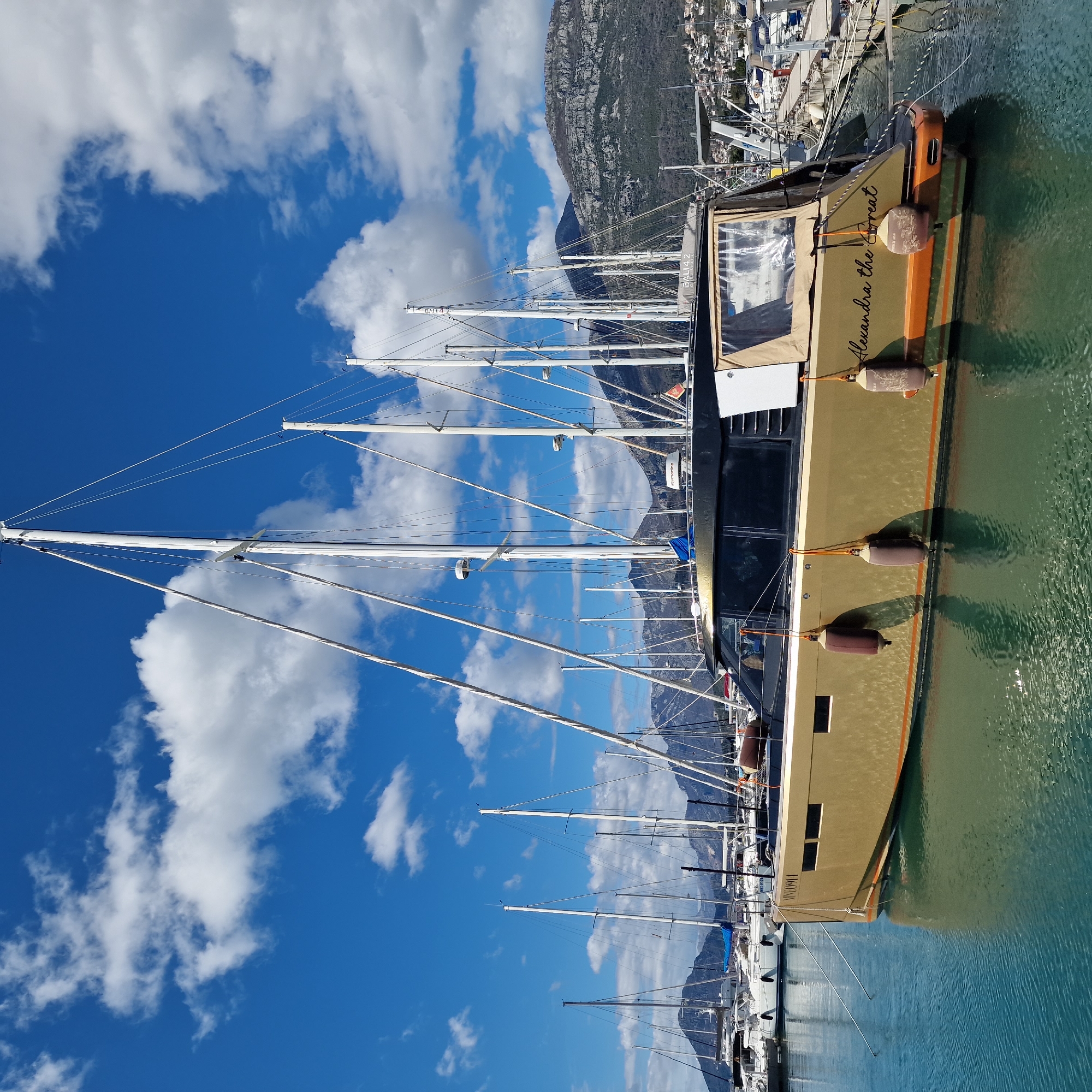 The image captures a view of a marina in Bar, Montenegro, on a sunny day with a blue sky dotted with fluffy white clouds. In the foreground is a golden-colored boat, named "Alexandra the Great," docked alongside the pier. It has a brown and clear canvas cover over the cockpit area and is secured by brown fenders hanging off the side. The water around the boat is green, reflecting the light and the boat's color. Behind the boat are numerous sailboat masts reaching upwards, creating a dense forest of white lines against the sky and mountains. In the background, there is a mountain range and the urban landscape of Bar with various buildings.