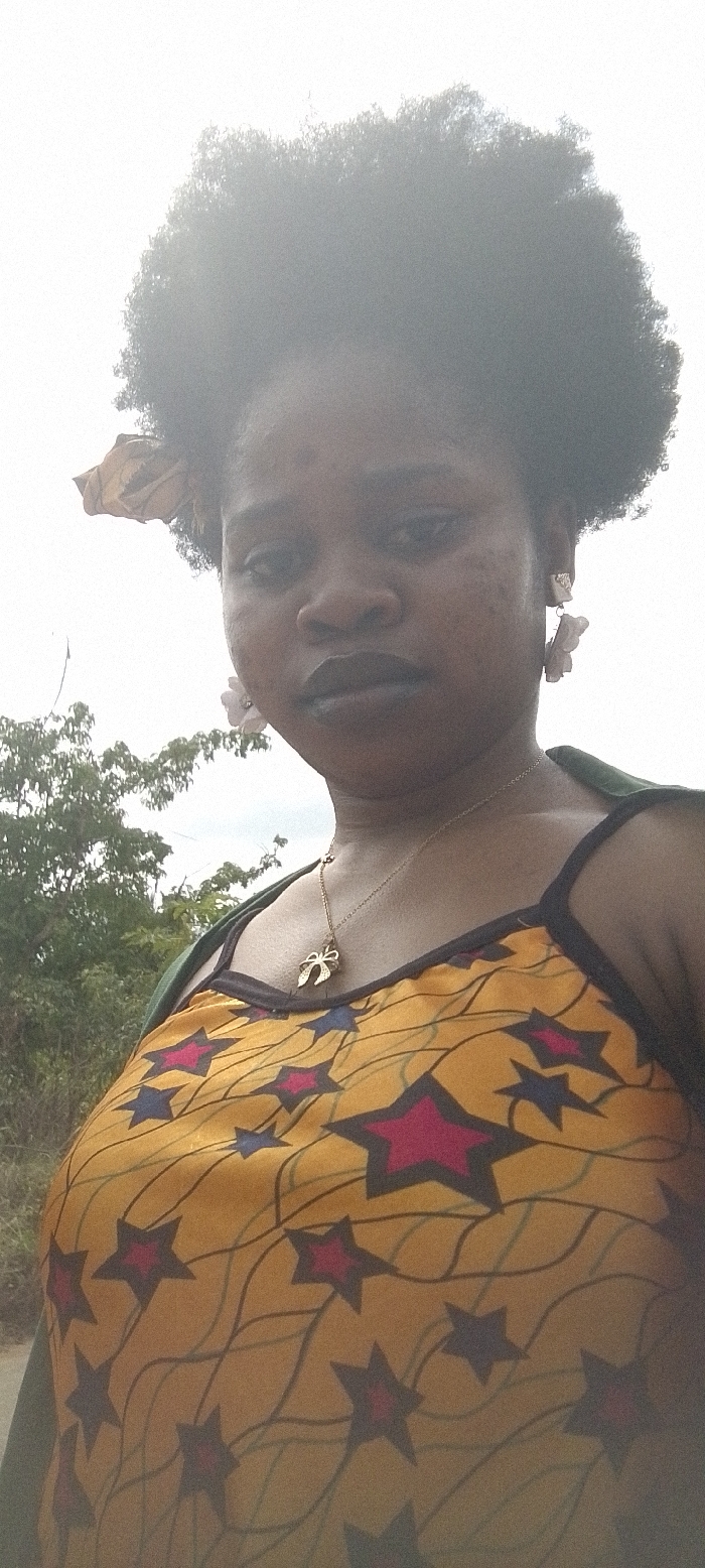 An individual, identified as a young adult Black female, is captured in a close-up, slightly low-angle photograph, likely a selfie. She has dark skin, dark kinky hair styled in an afro, with a light-colored, possibly tan, fabric hair accessory positioned on the left side of her head. Her expression is neutral, with her gaze directed towards the camera. She wears dark lip product, light-colored floral-shaped dangle earrings in both ears, and a gold-colored chain necklace featuring a bow-shaped pendant with small stones. Her attire consists of a yellow sleeveless top with black spaghetti straps, patterned with red and blue stars outlined in black, connected by thin dark lines. A dark green garment is visible draped over her shoulders. The background indicates an outdoor setting in Nsukka, Nigeria, with an overcast sky dominating the upper frame and green foliage, consistent with trees and bushes, visible behind her in the mid-ground.