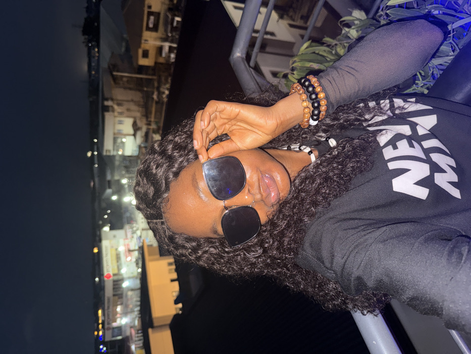 A person with wavy black hair is wearing sunglasses and a black t-shirt with white lettering. Multiple beaded bracelets adorn their wrist, and a necklace with beads sits around their neck. They are holding the sunglasses with one hand. The background shows a nighttime cityscape with buildings and lights. The image appears to be taken from a high angle, potentially a balcony or rooftop. A metallic railing is visible.