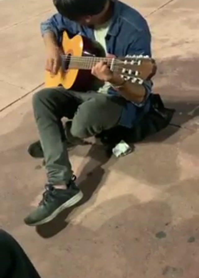 A young man sits cross-legged on a sidewalk or paved area, playing an acoustic guitar
