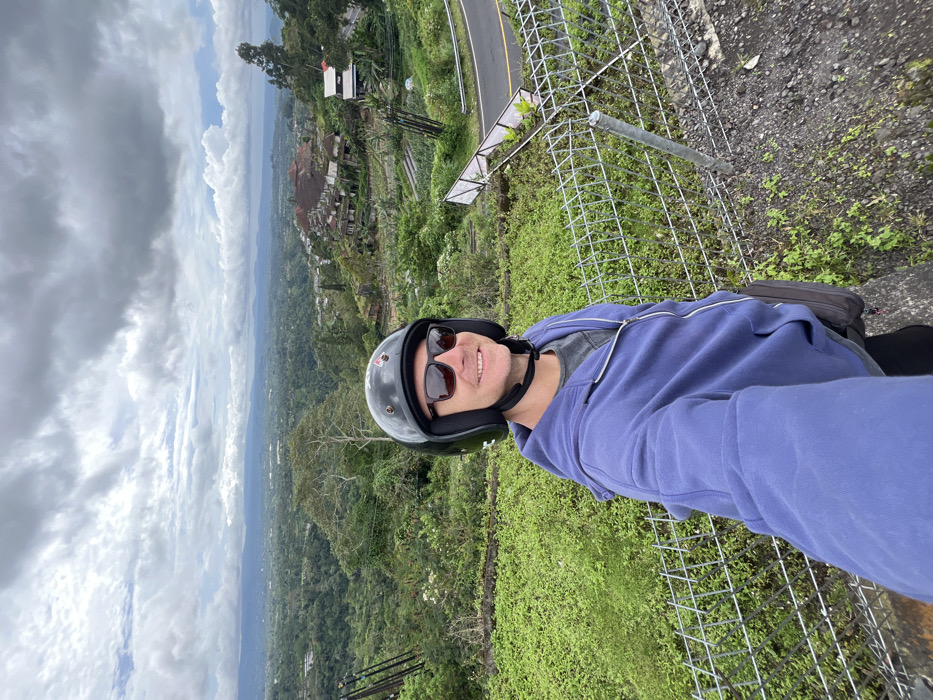 A male individual is depicted in a selfie, positioned at an elevated outdoor location overlooking a green, hilly landscape in Mekarsari, Indonesia