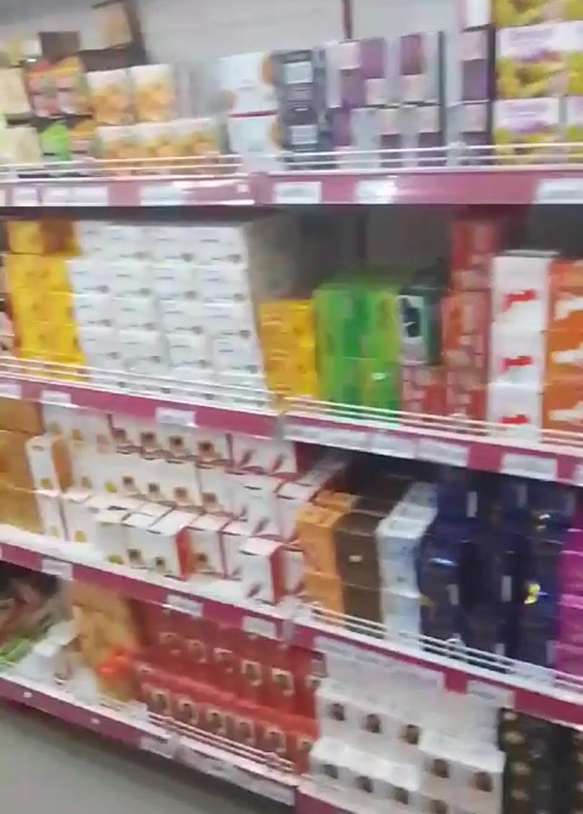 quick pan along a shelf in a shop, likely a supermarket or confectionery store, stocked with boxed chocolates