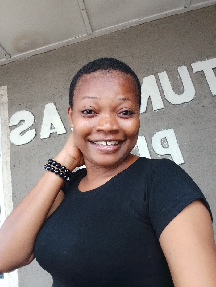 The image depicts an adult female in a portrait shot, smiling directly at the camera. She has short, dark hair, brown eyes, and is wearing a plain black short-sleeved t-shirt. A white stud earring is visible in her right ear, and a black beaded, two-strand bracelet with a small silver charm is on her left wrist. Her left hand is positioned behind her neck/upper shoulder. The background is a grey textured wall featuring white, three-dimensional raised letters. Visible segments of this lettering spell '2A' and 'TUMAS P'. This strongly indicates the location is a business named 'Tumas P...' (such as Tumas Pharmacy or Tumas Supermarket), establishments commonly found in commercial areas across Lagos, Nigeria. A white architectural trim or ceiling element is visible along the top edge of the frame. The scene is illuminated by natural light.