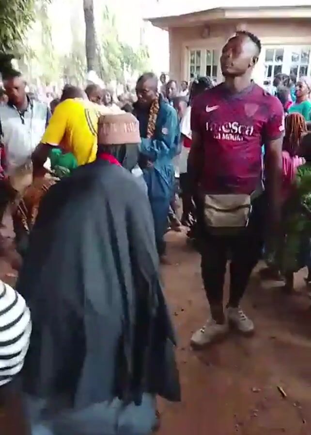 The video depicts a small crowd of people gathered in an outdoor area with a dirt ground