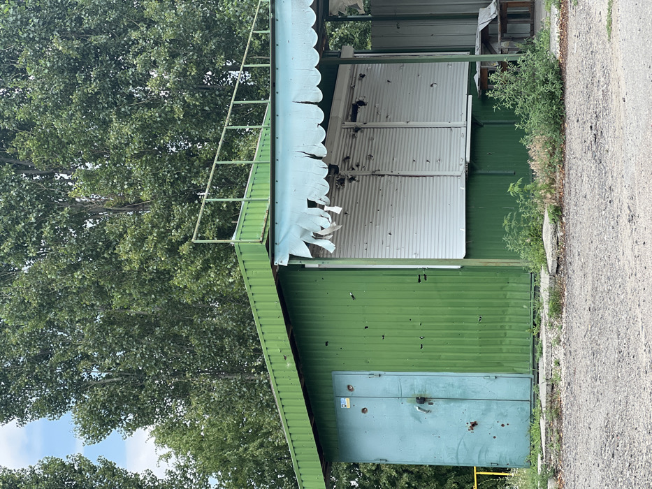 An outdoor image depicts a damaged, single-story, green-sided building or kiosk in Staryi Saltiv, Ukraine