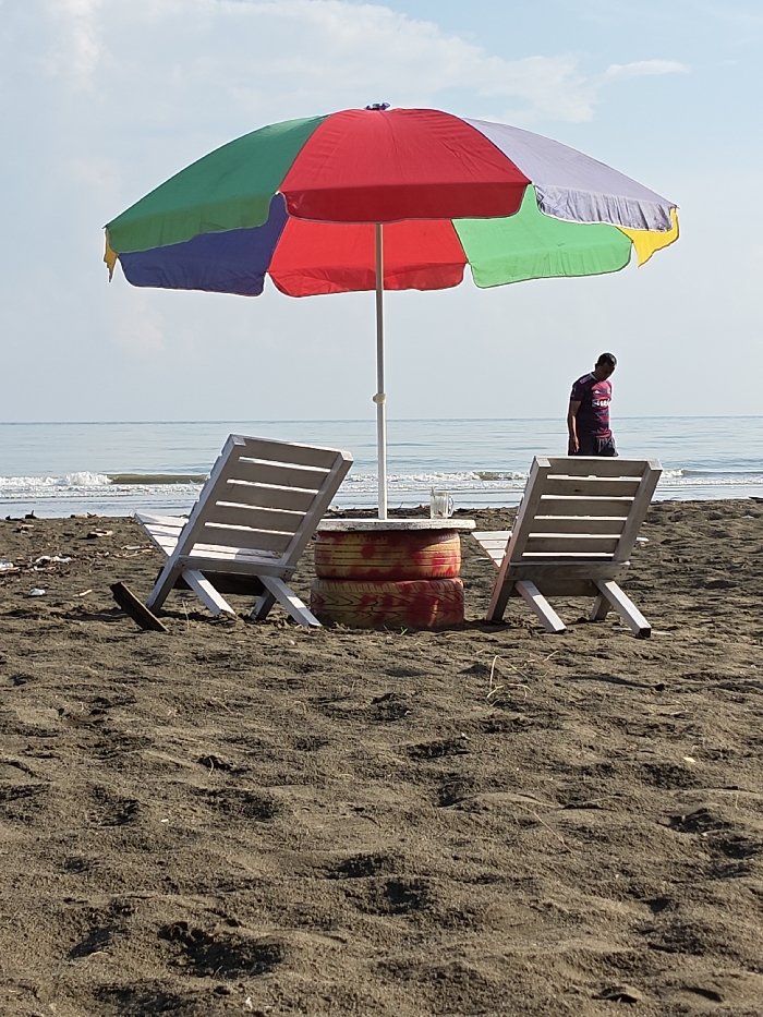 The image displays a beach scene in Reudeuep, Indonesia. In the foreground, dark, wet sand covers the ground. A multi-colored beach umbrella, featuring distinct red, green, blue, yellow, and lavender sections, stands centrally on a white pole. To its left and right, two light-colored wooden slatted lounge chairs are positioned, facing the ocean. Between these chairs, a small table is visible, fashioned from two stacked tires painted with red and yellow accents, topped with a flat surface. A clear drinking glass is placed on this table. In the mid-background, an adult male wearing a dark t-shirt and dark shorts stands in the shallow ocean water, looking downwards. Small waves are breaking near the shoreline, which contains scattered natural debris. The sky above is light blue with minimal white cloud cover.
