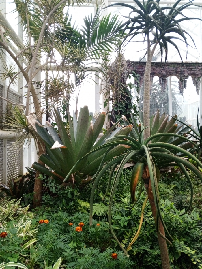 A lush indoor garden scene features a variety of plants. Large, broad-leafed plants with pointed tips dominate, while tall, slender palm trees rise above. One unique tree exhibits long, drooping leaves, resembling an aloe. Underneath, a vibrant bed of greenery is interspersed with small orange flowers. The background reveals a structure with arched windows and decorative stone accents, suggesting a greenhouse or conservatory setting.