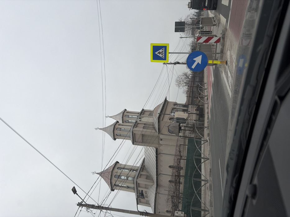 The image depicts a static street scene in Tuzla, Romania, viewed from inside a vehicle. The sky is uniformly overcast, indicating a lack of direct sunlight. In the foreground, the lower portion of the image shows the dark dashboard and the bottom edge of a windshield. The scene beyond is primarily composed of a road, a prominent church, and various urban elements. A multi-lane asphalt road runs horizontally across the midground. On the far right, a black van, possibly a Mercedes-Benz Vito, is visible, with a Romanian license plate starting "CT 19 M...". Adjacent to the road, on the right side, multiple traffic signs are present: a square yellow sign with a black pedestrian symbol indicating a crosswalk, and a round blue sign with a white arrow pointing diagonally downwards to the right, mounted on a yellow-and-black striped support. A red and white striped barrier is situated behind these signs. A section of the road in the immediate right foreground is marked with red paint. On the left side of the road, a sidewalk is bordered by a decorative metal fence featuring repeating arched sections. Behind this fence stands a light-colored (beige/grey) Orthodox church, the primary subject in the background. The church features two prominent bell towers or domes with arched windows, each capped with a dark, possibly metallic, roof and topped with a cross. A third, smaller dome is partially visible behind the main structure. Wrought-iron gates provide access to the church grounds. Bare trees or vines on trellises are visible within the church compound, suggesting a dormant season. A utility pole with multiple overhead wires and a streetlamp is positioned on the left, partially obscuring the church. No individuals are visible in the scene.
