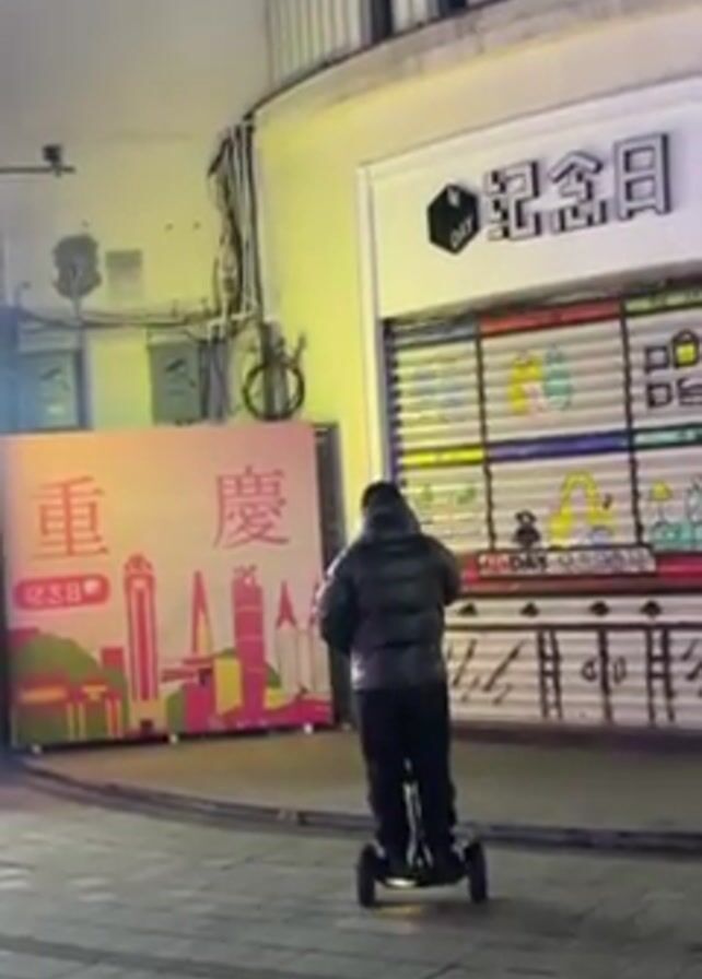 A man is standing on a two-wheeled self-balancing scooter, facing away from the camera, on a street in what appears to be an urban area. He is wearing a dark puffy jacket, black pants, and a baseball cap. He is holding a smartphone in his hands and looking down at it. To his left is a brightly lit sign for a food vendor with glowing text and images of food. Behind him is a large sign with a graphic cityscape and Chinese characters. To his right is a closed storefront with a colorful, childlike mural on the security gate. Overhead are exposed electrical wires and boxes. The lighting is dim, suggesting it is evening or night. The scooter is stationary as the man interacts with his phone.