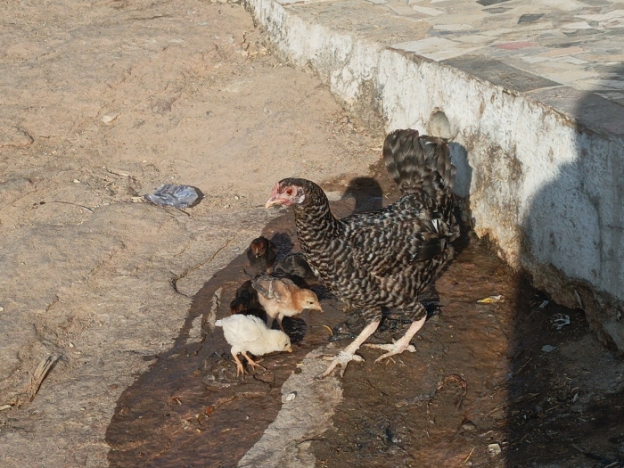 A hen with black and white plumage stands next to several chicks, one being white and another a light brown color. The hen and chicks are on a dirt surface with standing water nearby. Above them is a white wall with a gray bird sitting on the top edge. A piece of blue plastic sits on the dirt a short distance from the hen and chicks.