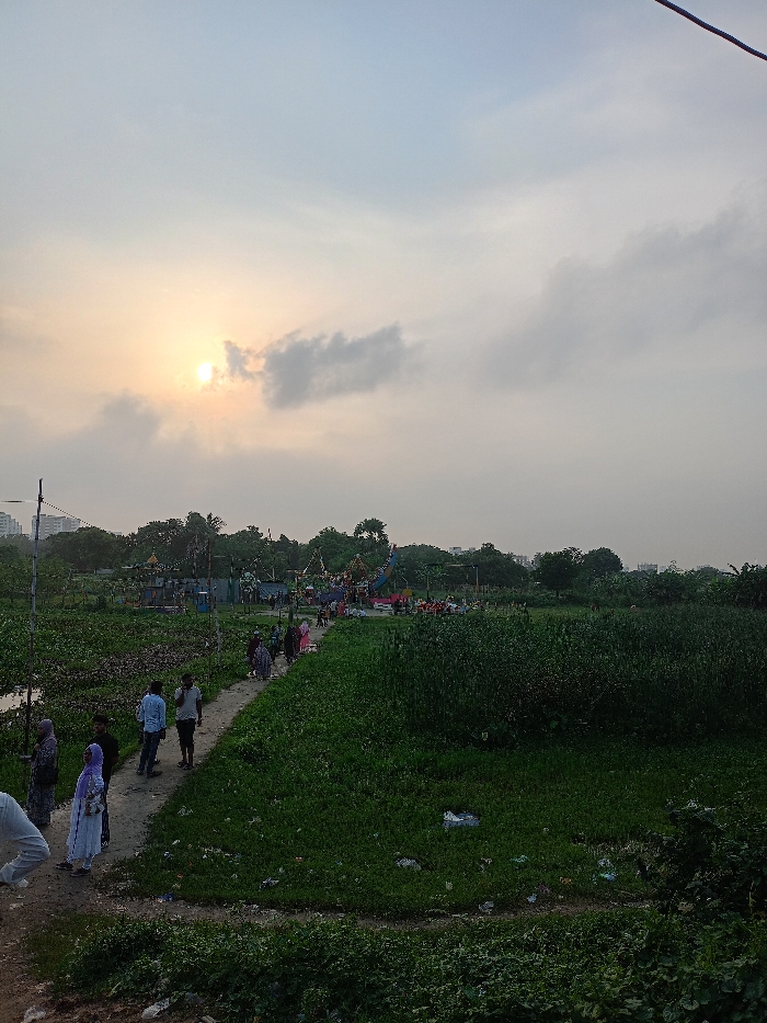 This image depicts an outdoor recreational area at dusk in Dhaka, Bangladesh. The low sun, partially obscured by light clouds, is positioned on the left side of a pale blue-grey sky. A winding dirt path extends from the lower left foreground towards the mid-ground. To the left of this path, a narrow body of water is heavily covered by dense green aquatic vegetation. A utility pole is situated on the far left, near the water. Approximately ten to fifteen individuals are present on or near the path. In the immediate foreground, a person in a light dress and purple headscarf walks alongside another individual in dark attire. Further along the path, three men are visible, one in a light blue shirt, one in a white t-shirt and dark shorts. Beyond them, a group of predominantly women in various colored traditional garments (e.g., pink, blue) walk towards the background. The area to the right of the path is an expansive, uncultivated field of dense green vegetation, interspersed with scattered white debris. In the mid-ground, at the path's end, a temporary amusement park or fair is established. This area features multiple brightly colored structures, including what appears to be a Ferris wheel or similar tall ride on the left, and various smaller stalls or attractions. People are discernible within this amusement area. In the far background, particularly on the left, the silhouettes of multi-story urban buildings are visible, indicating the city's proximity. The overall lighting suggests late afternoon or early evening.