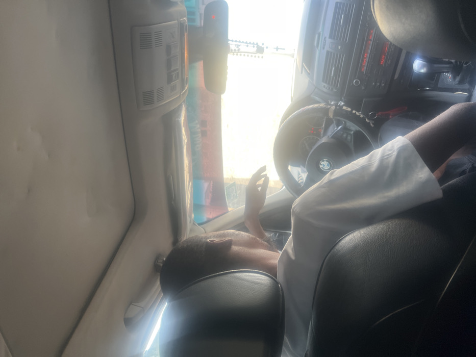 The image displays the interior of a vehicle, identified as a BMW by the steering wheel emblem, viewed from a rear passenger seat looking forward. A person, presumed to be the driver, is seated, with their head and right shoulder visible from behind. They wear a white, short-sleeved garment, and their right arm is extended, resting on the steering wheel or dashboard. The vehicle's dashboard is dark-colored, featuring a stereo/infotainment unit, climate control vents, and an automatic transmission shifter. A rosary with a crucifix hangs from the rearview mirror. The light-colored headliner above shows minor sagging. Strong daylight enters through the windshield, which has a blue and red tinted strip at the top. Vague reddish-brown structures, consistent with buildings, are visible through the windshield, indicating an outdoor setting in Giginyu, Nigeria. No direct interactions between individuals are discernible.