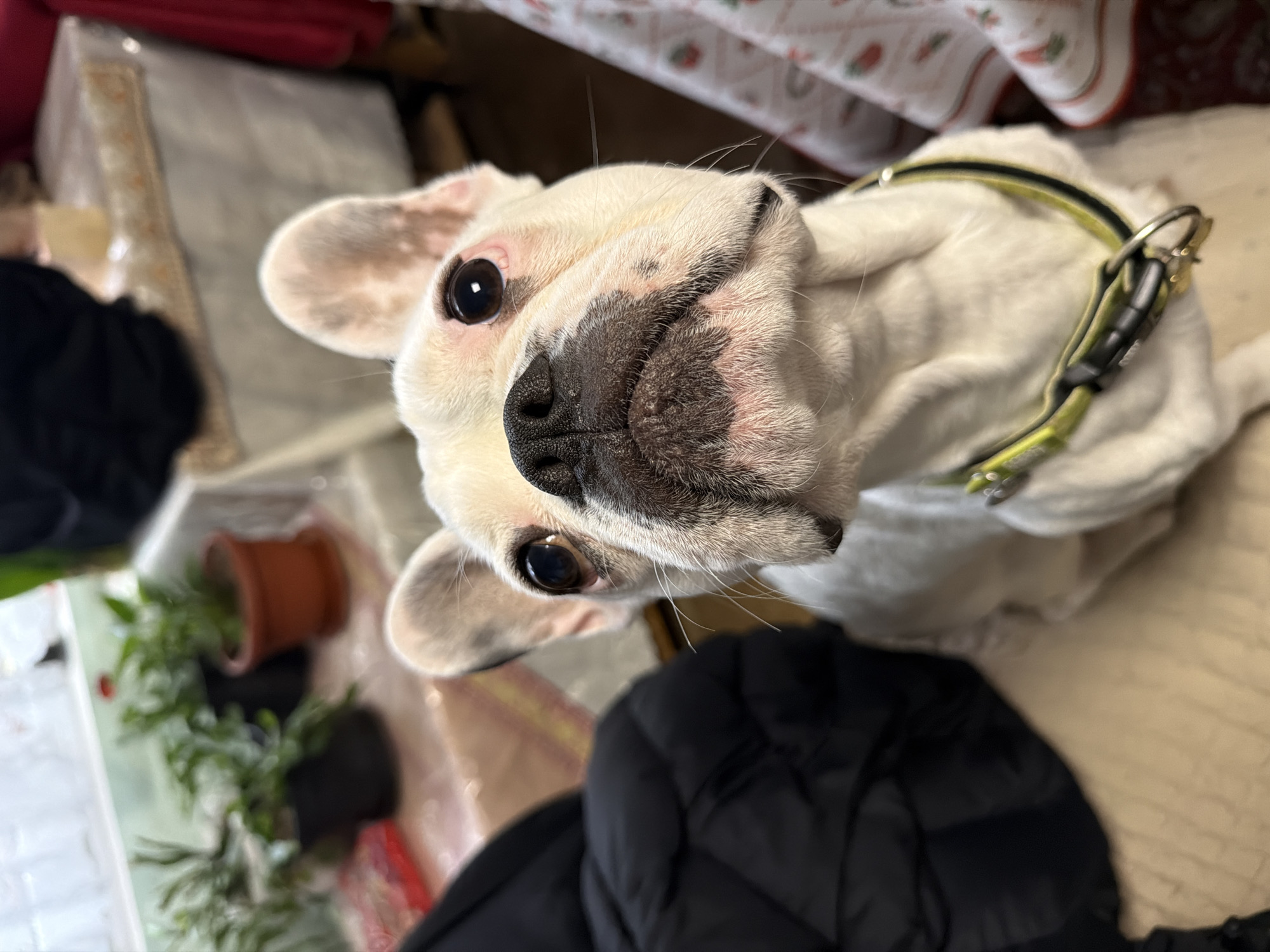A close-up, slightly distorted, eye-level shot depicts a white French Bulldog with a black and grey muzzle and a black and neon green collar. The dog is looking upwards towards the camera. Below the dog, part of a black puffy jacket is visible. To the left, there are potted plants. In the background, there is a table with a decorated tablecloth and some other household items. The location, Dupnitsa, Bulgaria, is not explicitly suggested by any features within the image.