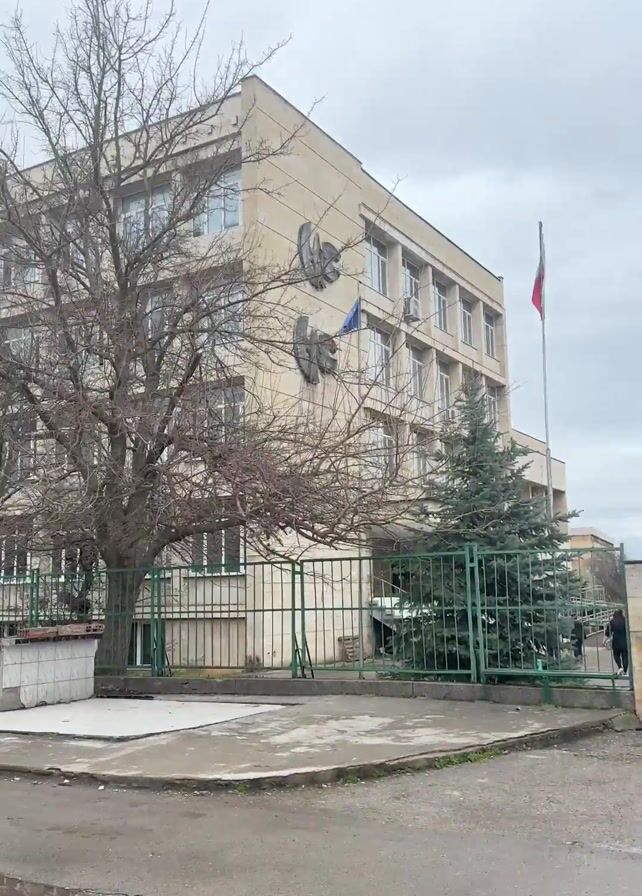 n outdoor scene on a cloudy day. The camera pans up from the ground to reveal a school building with a Bulgarian flag. In the foreground, there is a puddle-covered asphalt area with a gate leading to the school. The camera then focuses on a pile of burning papers on the asphalt, next to a puddle of muddy water. The papers are actively on fire, with flames visible and parts of the paper already charred. There is some debris and small objects scattered around the burning papers.