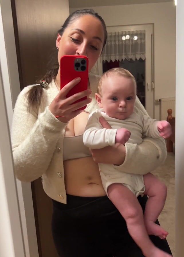 A woman is taking a selfie with a baby in her arms in front of a mirror. The woman has dark hair pulled back in a ponytail and is wearing a white cardigan, a beige bra, and black leggings. The baby is wearing a white onesie. The woman is holding a red smartphone in her hand and looking at the screen. The baby is looking to the side with its thumb in its mouth. The background includes a door, a window with curtains, and a hallway.