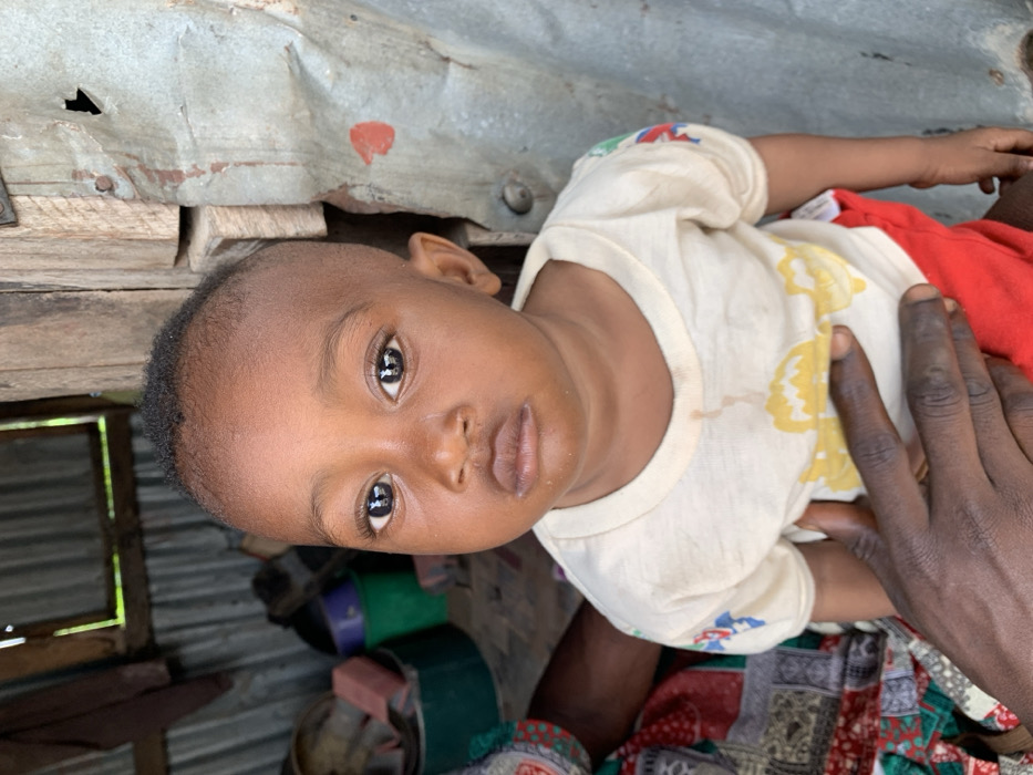 The image depicts a young child, approximately one to two years old, with dark skin, short dark hair, and brown eyes, looking directly at the camera
